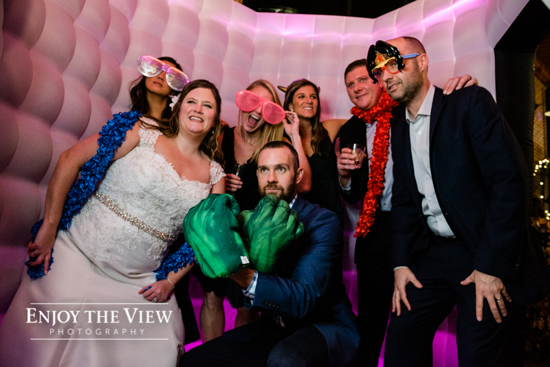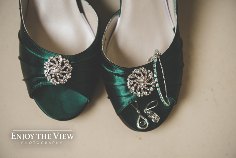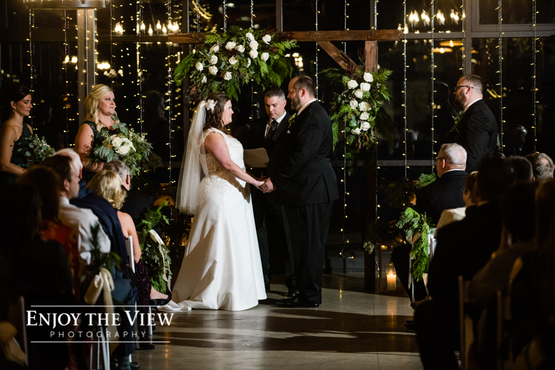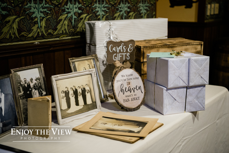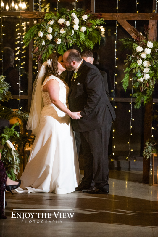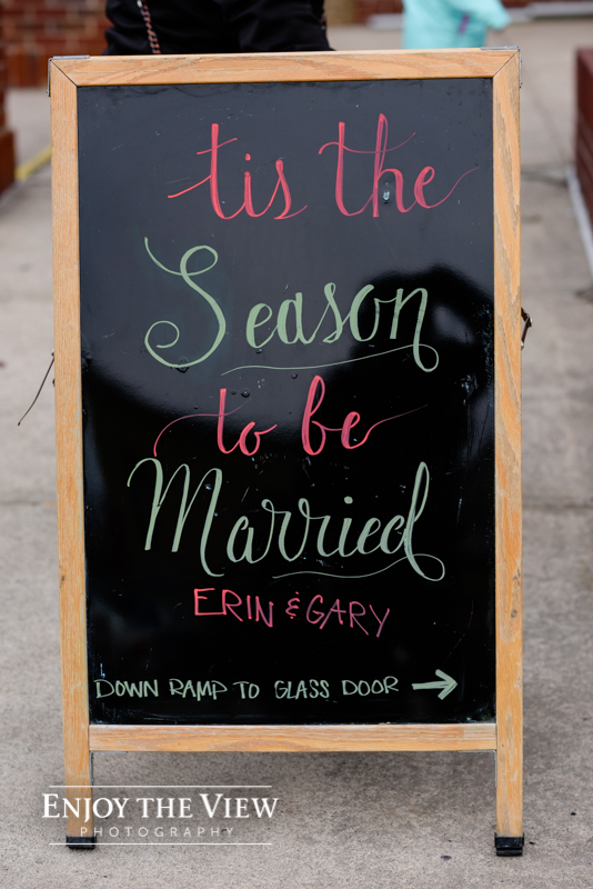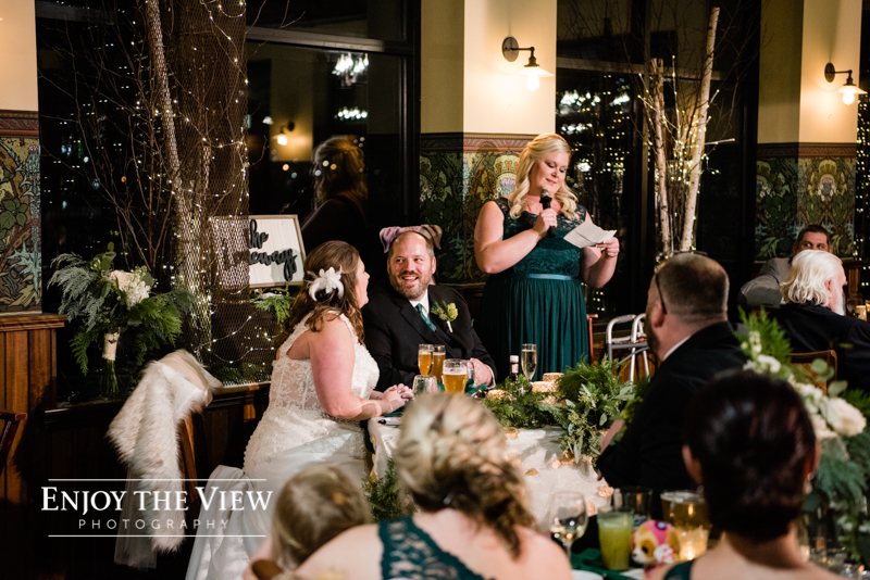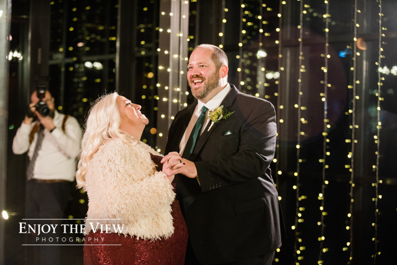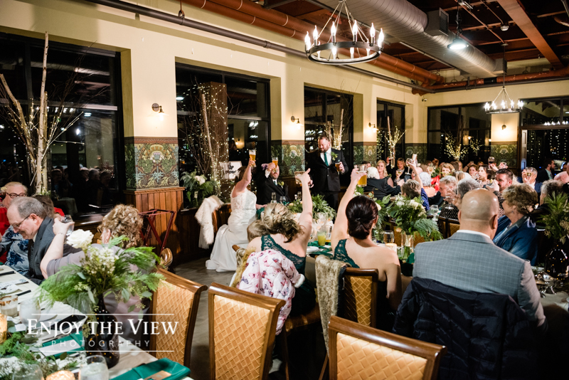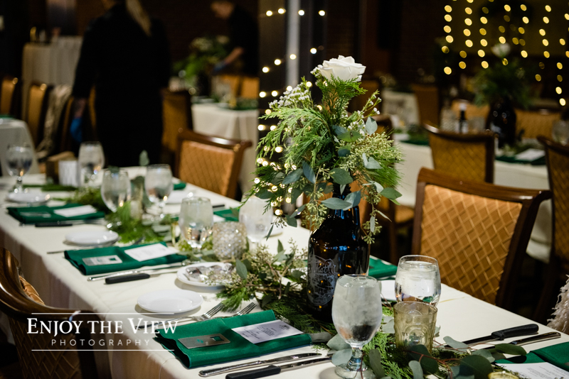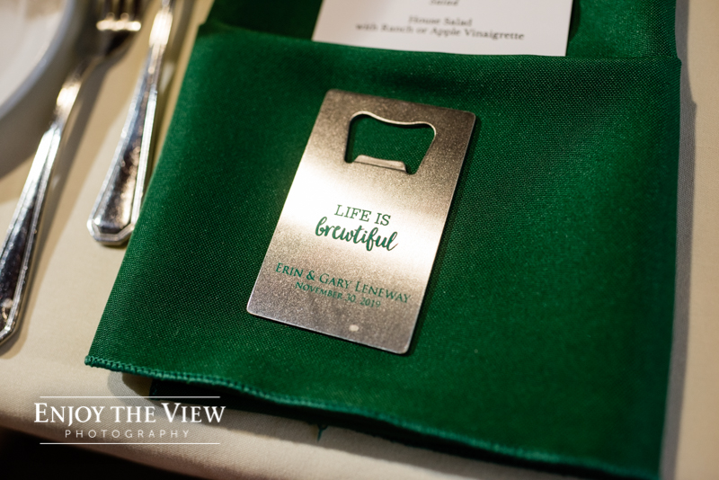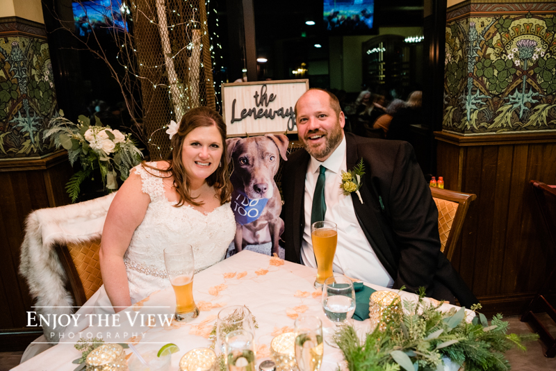 Erin & Gary’s wedding was in the evening after sunset so they lit the room with TONS of white twinkle lights throughout the ceremony & reception areas. It was the perfect winter wedding vibe with emerald green and ivory accents. They even had their doggie as part of their day with a giant cardboard cutout and a drink named after him!