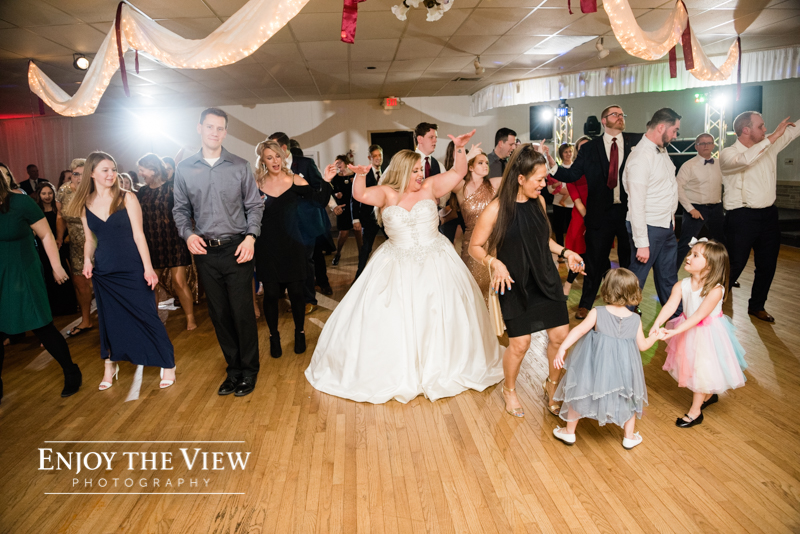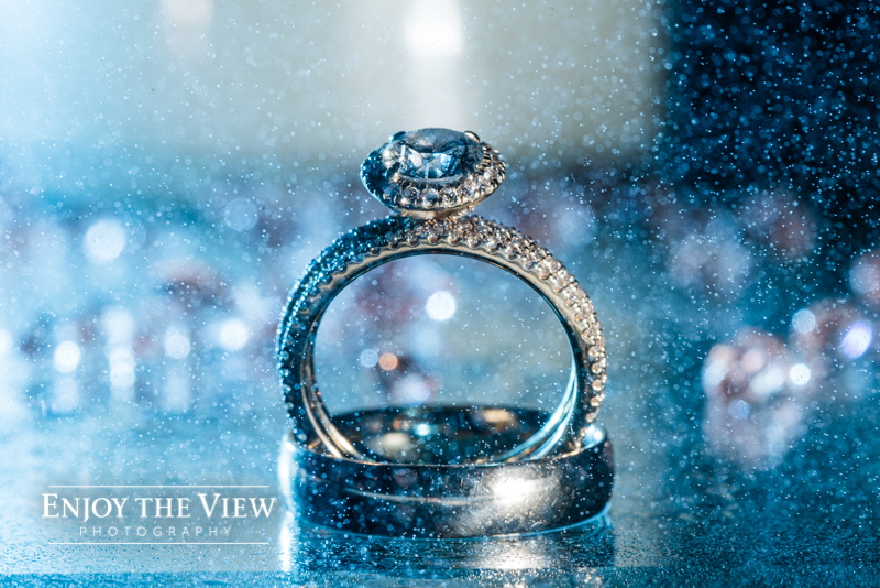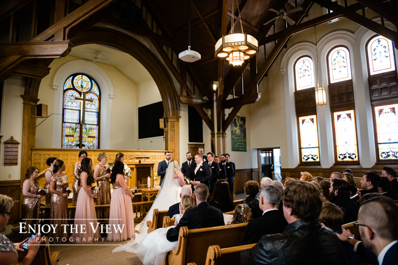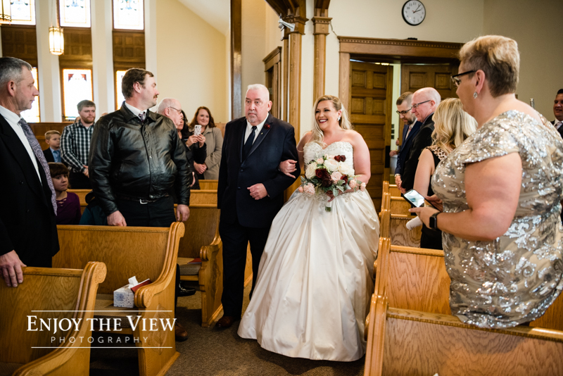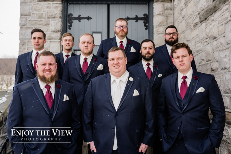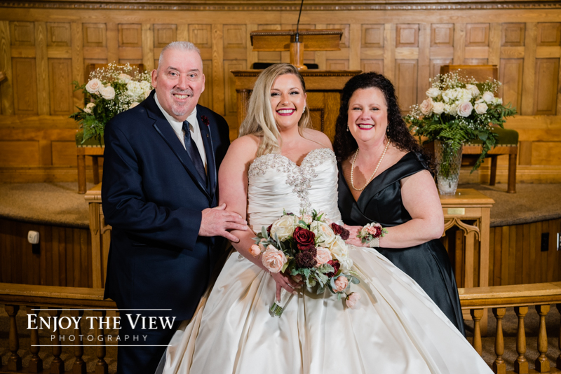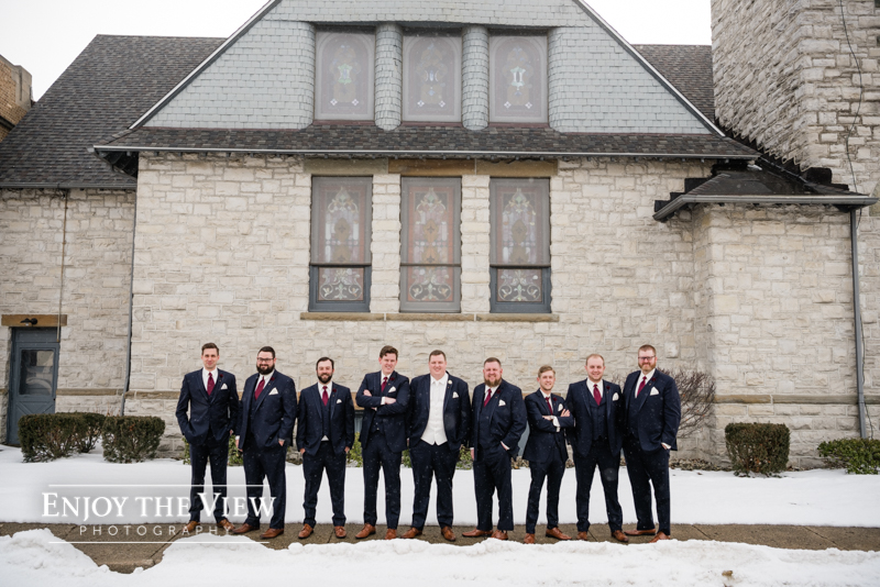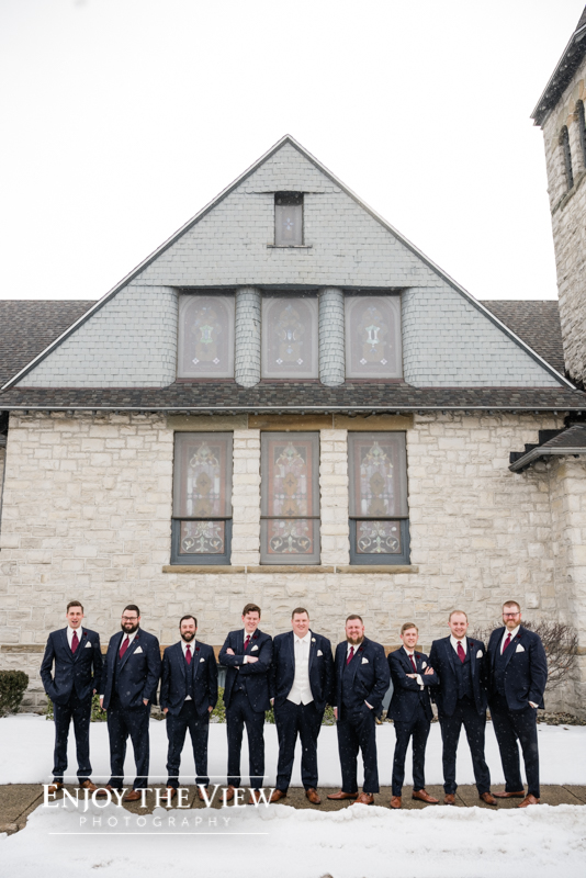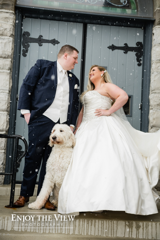 The snow wasn’t even close to the only beautiful part though. Chelius was absolutely show-stopping in her custom gown, the church was a wonderful setting for the ceremony, the bridesmaid’s rose gold dresses were the perfect compliment to the flowers and winter setting, and the bride’s ring was gorgeous! Even their cute doggie got in on the action for a few photos following the ceremony.