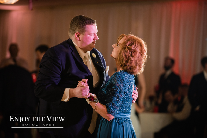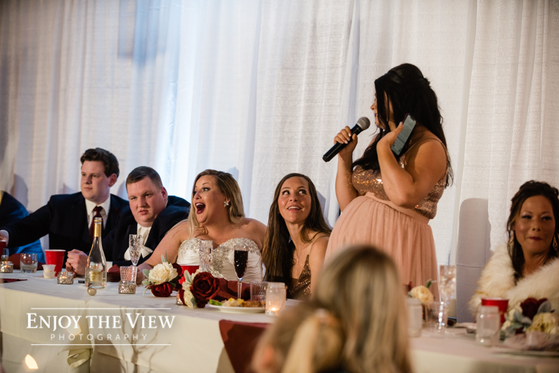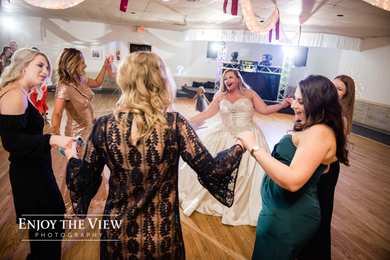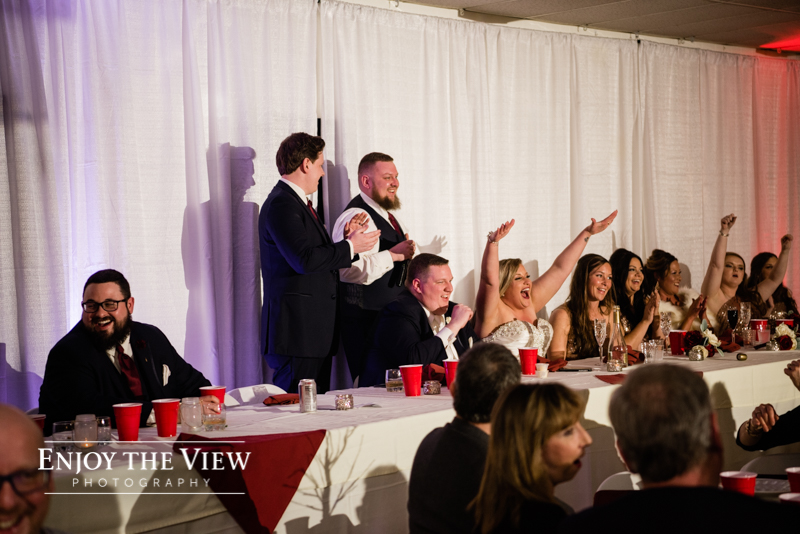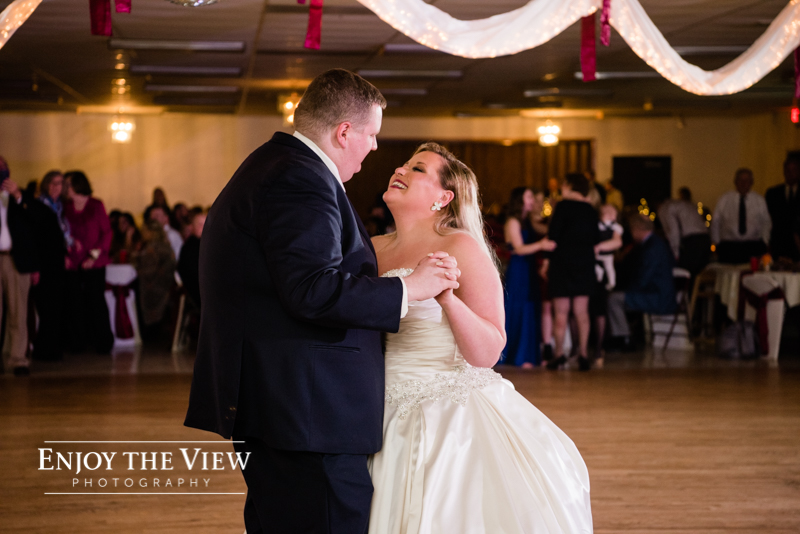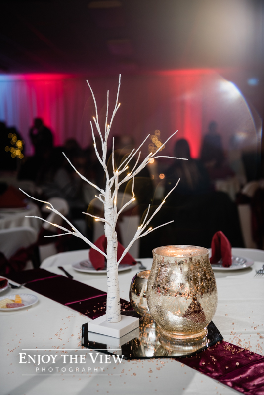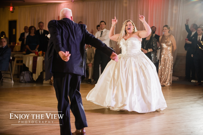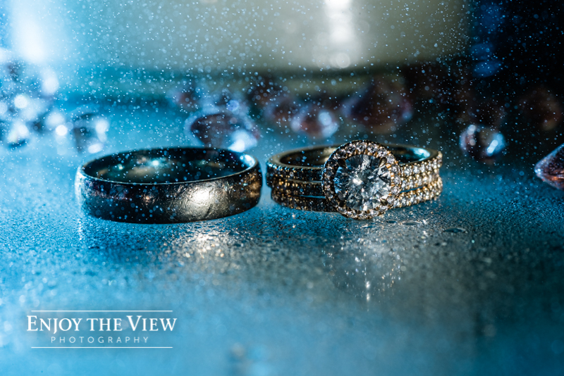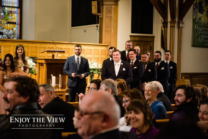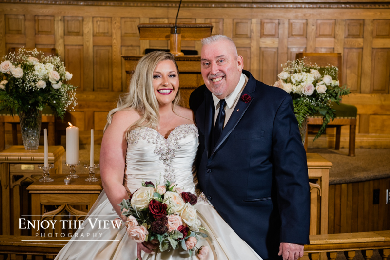 The snow wasn’t even close to the only beautiful part though. Chelius was absolutely show-stopping in her custom gown, the church was a wonderful setting for the ceremony, the bridesmaid’s rose gold dresses were the perfect compliment to the flowers and winter setting, and the bride’s ring was gorgeous! Even their cute doggie got in on the action for a few photos following the ceremony.