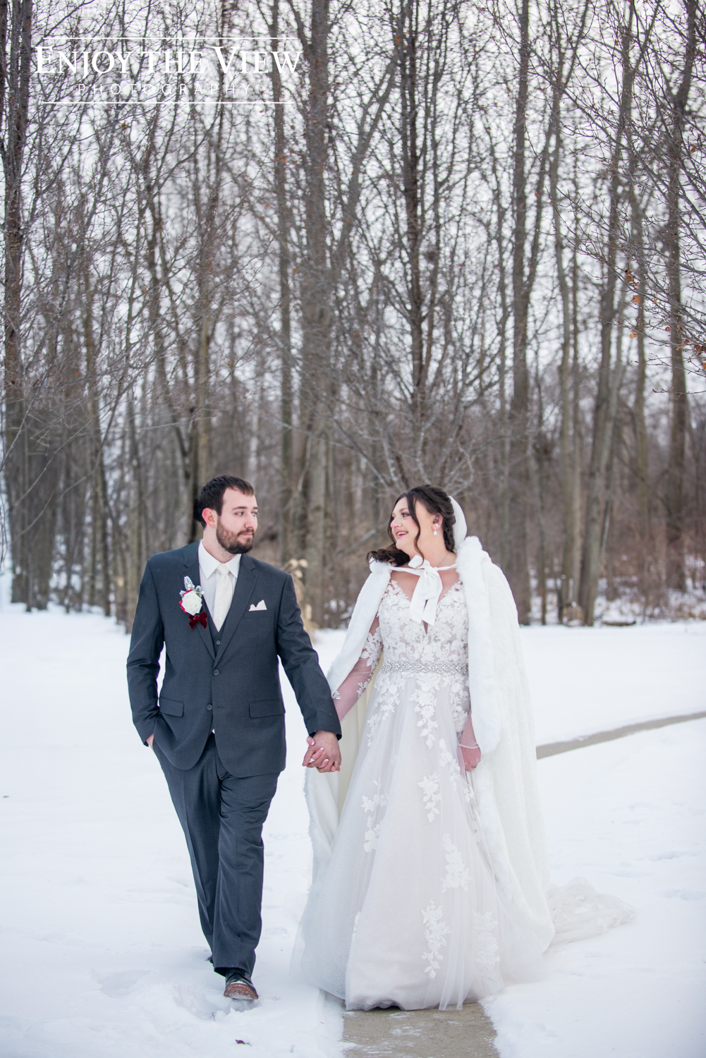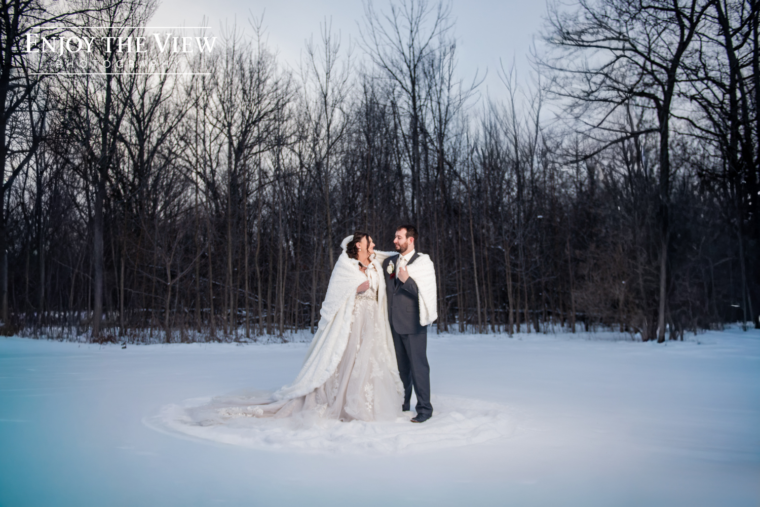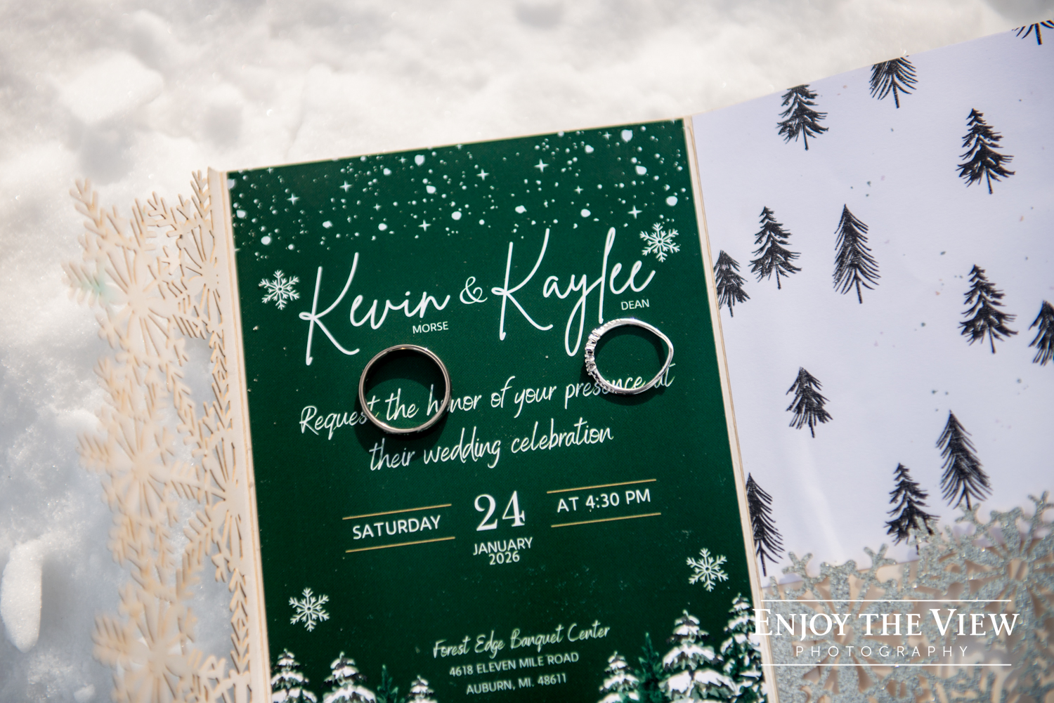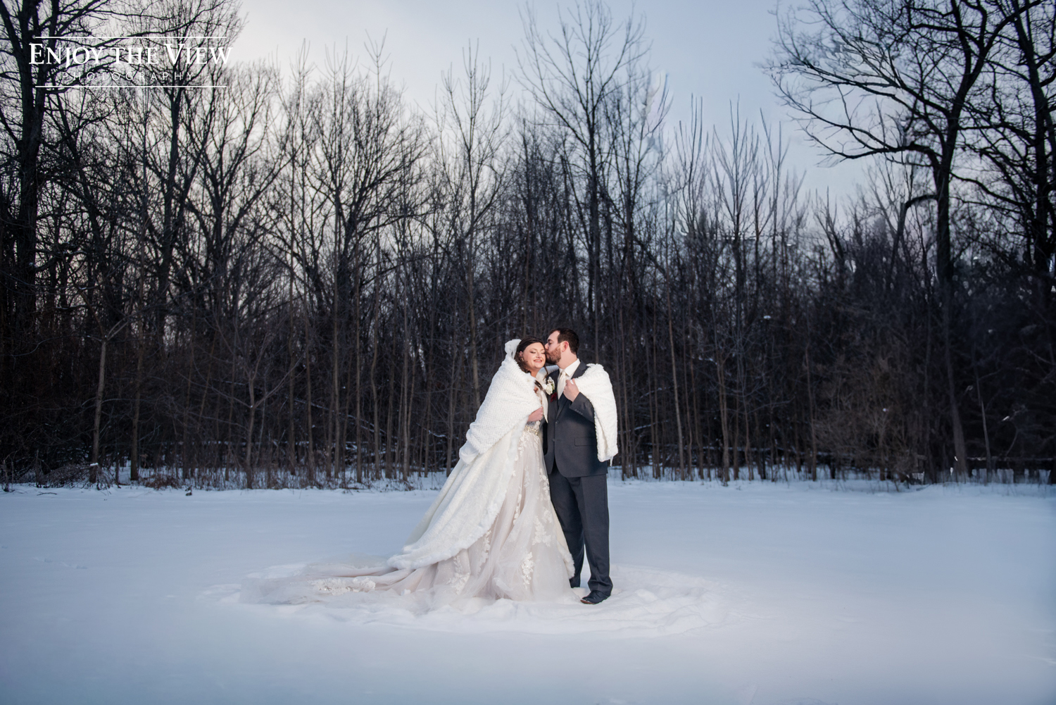 Kaylee and Kevin were married in January at Forest Edge Banquet Center on her great-grandparents’ anniversary. Kaylee did such an amazing job with the decor – every surface was covered with beautiful winter sparkle, from snowflakes to pine trees to a snow globe backdrop for photos.